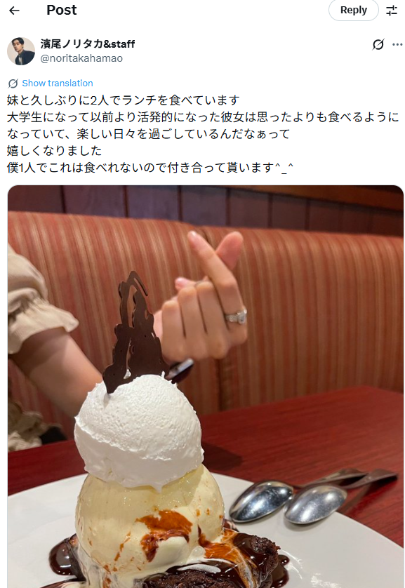 濱尾ノリタカさんには4歳年下の妹がいます。妹さんは芸能活動をしていない一般の方で、顔写真や実名などは一切公表されていません。ただ、本人のSNS投稿や周辺情報から、兄妹仲がかなり良好であることが分かります。特に話題になったのが、妹さんと2人でランチに行ったという投稿です。芸能人の兄と一般人の妹という関係性だと、距離ができてしまうケースも少なくありませんが、濱尾ノリタカさんの場合はその逆。大人になってからも2人きりで食事に行く関係性は、かなり信頼関係が深い証拠だと思います。